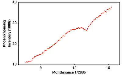 Inventaire de houses for sale in Phoenix, AZ de juillet 2005 à mars 2006. Le 10 mars 2006, un nombre probablement supérieur à 14,000 (environ la moitié) de ces maisons en vente étaient vides (source : Arizona Regional Multiple Listing Service.) - (en) « D.R. Horton warning weighs on builders: Largest home builder cuts 2006 outlook on difficult housing market », Dow Jones, .