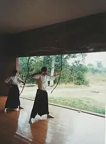 Le kyūdō est également pratiqué à courte distance pour l'initiation et l'entraînement, à une longueur d'arc d'une cible de paille appelée makiwara (paille roulée). Il existe un sharei demandant un tir sur un makiwara pour les pratiquants les plus avancés, si bien qu'après avoir étudié une vie, on se retrouve à faire un exercice similaire à celui des débutants…
