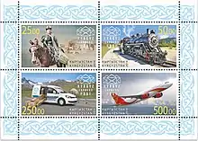 Le 18 novembre 2014, Kyrgyz Express Post a émis ses premiers timbres-poste et son bloc-feuillet. L'émission a été dédiée au 140e anniversaire de l'UPU. Les timbres montrent l'histoire du service postal kirghize, surtout les moyens de transport postal[3].