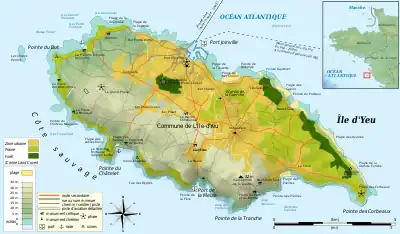 Le territoire municipal de L’Île-d’Yeu s’étend sur 2 466 hectares. L’altitude moyenne de la commune est de 17 mètres, avec des niveaux fluctuant entre 0 et 32 mètres[5],[6].