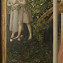 Un paradoxe qui serait contraire à l'iconographie de la peinture chrétienne est à souligner : Adam et Ève chassés du Paradis paraissent fouler de leurs pieds les roses du jardin de Marie[5], car rien ne les sépare (comme dans les autres Annonciations par des palissade, clôture, mur crénelé...) ce qui fait dire à l'historien de l'art Daniel Arasse que ce tableau ne serait pas de Fra Angelico à cause de cette « absurdité théologique »[6]. Cependant, un examen attentif de ce détail permet de voir que ces roses ne se trouvent pas au niveau-même des pieds d'Adam et d'Eve, mais au bout des branches d'un rosier, lequel est situé à un autre plan (plus en avant) que celui des deux personnages.
