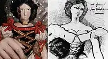 La poupée représentée sur ce tableau date de toute évidence des années 1830. Elle devait avoir une tête - ainsi que les avant-bras et les jambes – en papier mâché, assemblée sur un corps en toile bourrée ou en cuir. De provenance allemande, elle fut probablement fabriquée par Andreas Volt à Hildburghausen, en Thuringe[7]. Le costume folklorique de cérémonie peut-être attribué à une région de l’Est de la France (Alsace ?) ou bien à un pays de l’Europe de l’Est (Bavière, Autriche, Pologne ?). La jupe est en feutrine ou étamine de laine rouge, le bas est agrémenté de trois rangées de rubans noir et or. Le corselet est en velours noir et or. Le chemisier, en mousseline de coton ou batiste (lin fin) est rehaussé de rubans noués en satin rouge. Les bijoux : tour de cou en velours noir avec un important bijou au centre, ainsi que les bracelets aux deux poignets, témoignent d’une appartenance aristocratique. D’ailleurs, l’enfant portant la poupée est probablement d’origine aristocratique ou d’un haut rang dans la société du XIXe siècle : sa robe en plumetis doublée de satin blanc, bordée d’une large collerette festonnée, en décolleté, atteste d’une grande richesse. Il est à remarquer le collier en perles d’ambre, comme les pendentifs aux oreilles : il s’agit d’une tradition indiquant l’âge – douze ou treize ans (sic) – de l’enfant. La coiffure de l’enfant comme celle de la poupée confortant la date d’exécution de ce tableau[8].