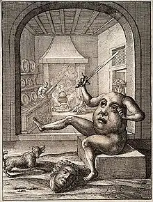 C'est aussi le cas pour John Ogilby dans le contexte de l'histoire troublée de l'Angleterre du XVIIe siècle[9]. Le seul membre visible dans l'illustration de la fable de Wenceslas Hollar (voir ci-dessus) est la tête cassée d'une statue endommagée par le ventre aveugle, brandissant l'épée. La référence à la décapitation parlementaire du roi Charles Ier et à l'effondrement du gouvernement au cours de la période républicaine qui a suivi est flagrante. Au début du XIXe siècle, le traducteur anglais de La Fontaine, John Matthews, va étendre encore plus la fable. Partant du contexte romain, il décrit les conflits sociaux en termes plus ou moins contemporains et laisse ainsi entendre que la fable soutient le pouvoir du parlement aristocratique de son époque sans avoir besoin de le dire d'emblée[10].