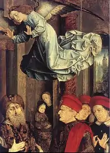 Le ciel est visible à travers de hautes ouvertures dans l'architecture en abside du fond de la scène et une ouverture à droite montre des architectures médiévales qu'on suppose d'être de Gand ou de Bruges plutôt que les tours Renaissance du palais ducal d'Urbino