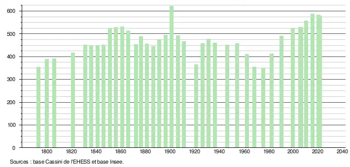 L'évolution du nombre d'habitants est connue à travers les recensements de la population effectués dans la commune depuis 1793. Pour les communes de moins de 10 000 habitants, une enquête de recensement portant sur toute la population est réalisée tous les cinq ans, les populations légales des années intermédiaires étant quant à elles estimées par interpolation ou extrapolation[51]. Pour la commune, le premier recensement exhaustif entrant dans le cadre du nouveau dispositif a été réalisé en 2005[52].