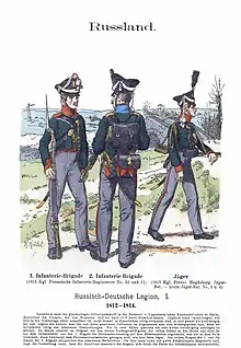 Vers la fin de 1813, un accord entre Lord Castlereagh, premier ministre britannique, et Ernst Friedrich Herbert zu Münster, ministre du royaume de Hanovre redevenu une possession personnelle du roi d'Angleterre, prévoit de rattacher la Légion russo-allemande, estimée à 6 000 hommes, à l'armée hanovrienne, son financement et son équipement étant assurés par Londres[9].