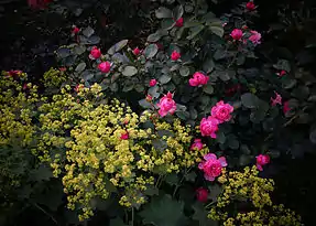Alchemilla mollis (Buser) Rothm. et buisson de 'Léonard de Vinci' en Russie dans un jardin de l'oblast de Vladimir.
