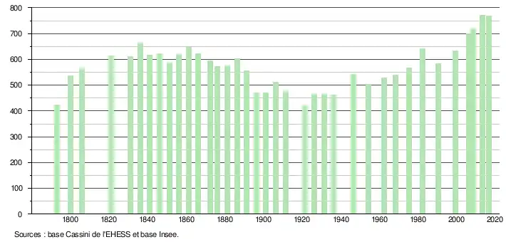 L'évolution du nombre d'habitants est connue à travers les recensements de la population effectués dans la commune depuis 1793. Pour les communes de moins de 10 000 habitants, une enquête de recensement portant sur toute la population est réalisée tous les cinq ans, les populations légales des années intermédiaires étant quant à elles estimées par interpolation ou extrapolation[6]. Pour la commune, le premier recensement exhaustif entrant dans le cadre du nouveau dispositif a été réalisé en 2008[7].