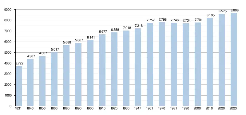 Les chiffres des années 1831 à 1970 tiennent compte des chiffres des anciennes communes fusionnées.