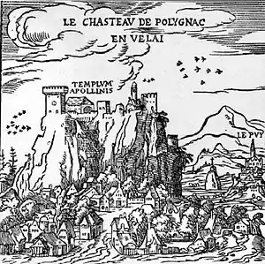 La légende selon laquelle la forteresse aurait succédé aux vestiges d'un temple antique dédié à Apollon trouve son origine à la Renaissance. En 1533, lors de la visite de François Ier à Polignac, le vicomte de Polignac lui montre une sculpture antique : le masque d’Apollon. En 1561, l'humaniste florentin Gabriel Symeoni publie un récit littéraire de voyage où figure une gravure illustrant l’étape à Polignac avec la mention Templum Apollinis au-dessus du site. Vers 1625, Gaspar Chabron, généalogiste de la famille de Polignac, ajoute à ce récit la description d’une salle ornée de peintures murales qu’il interprète comme étant le temple. Au XVIIIe siècle, Faujas de Saint-Fond complète la description d'une salle alors en voie de détérioration. La salle disparaît dans le courant du XIXe siècle[4], époque où elle trouve, ses plus ardents défenseurs dans les érudits Charles Mangon de La Lande, François Gabriel de Becdelièvre, Auguste Aymard ou encore Albert Boudon-Lashermes.