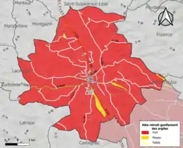 Les mouvements de terrains susceptibles de se produire sur la commune sont soit des glissements de terrains soit des mouvements liés au retrait-gonflement des argiles. Près de 50 % de la superficie du département est concernée par l'aléa retrait-gonflement des argiles, dont la commune de Lézat-sur-Lèze[26]. L'inventaire national des cavités souterraines permet par ailleurs de localiser celles situées sur la commune[27].