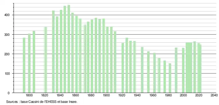 L'évolution du nombre d'habitants est connue à travers les recensements de la population effectués dans la commune depuis 1793. Pour les communes de moins de 10 000 habitants, une enquête de recensement portant sur toute la population est réalisée tous les cinq ans, les populations légales des années intermédiaires étant quant à elles estimées par interpolation ou extrapolation[26]. Pour la commune, le premier recensement exhaustif entrant dans le cadre du nouveau dispositif a été réalisé en 2004[27].