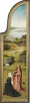 Peeter Scheyve et saint Pierre, représentés sur le panneau de gauche, apparaissent à la droite du Christ, une place d'honneur. Derrière eux, Joseph fait sécher des vêtements près d'un feu[2]. Bien qu'il s'agisse du seul triptyque dans lequel il représente un donateur, Bosch continue à respecter les codes de la représentation des donateurs. Au second plan de ce panneau, au milieu d'un champ, d'étranges créatures dansent (l'un, de trois quart dos, semble exhiber son sexe à l'attention d'une dame qui parait offusquée) et jouent d'un instrument de musique semblable à une cornemuse. Finalement, le panneau de droite, la donatrice agenouillée avec sainte Agnès derrière elle, debout, tenant une Bible. Derrière les deux femmes, un écu avec une fleur-de-lys a été peint. Un agneau, l'emblème de sainte Agnès, allongé sur le sol, se trouve au-dessus de la femme à genoux. À l'arrière plan, une femme tente d'échapper à un loup, alors qu'un homme - plus près — n'a pas pu échapper à un second loup et est en train d'être dévoré.