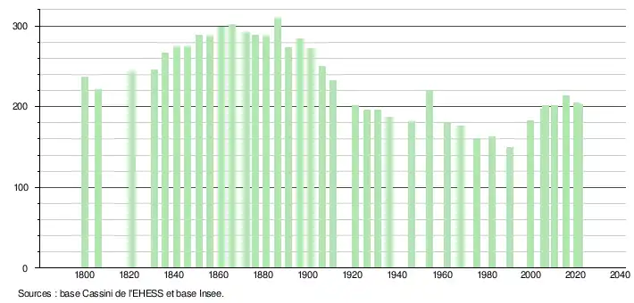 L'évolution du nombre d'habitants est connue à travers les recensements de la population effectués dans la commune depuis 1800. Pour les communes de moins de 10 000 habitants, une enquête de recensement portant sur toute la population est réalisée tous les cinq ans, les populations légales des années intermédiaires étant quant à elles estimées par interpolation ou extrapolation[13]. Pour la commune, le premier recensement exhaustif entrant dans le cadre du nouveau dispositif a été réalisé en 2005[14].