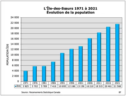 Au cours des 50 dernières années, les recensements de Statistique Canada témoignent de la croissance soutenue du quartier de L'Île-des-Sœurs. En 1971 l'île ne comptait que 3 925 résidents. En 2021, 21 568 personnes y vivent.