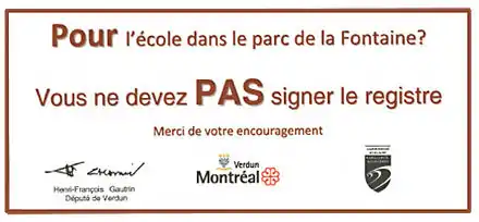 En , la ministre de l'Éducation, du Loisir et du Sport, Line Beauchamp, annonçait l'octroi de 10,5 millions $ [5] pour la construction de la deuxième école à la condition que l'arrondissement s'engage à fournir le terrain. Au cours des six mois, le maire a présenté le parc de la Fontaine comme étant « le SEUL site disponible »[6],[7],[8]. La communauté insulaire s'est mobilisée en formant le Comité de protection du parc de la Fontaine. Il s'ensuivit une vive opposition des 1 570 signataires d'une pétition issus des huit zones contiguës totalisant 1 842 logements [9],[7].