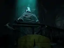 Chapitre 6 : Le Marais - Comme Valembois avant lui, le journaliste arrive dans le marais en amont des chutes d'eau. Cependant, la traction de l'Hydraflot jusqu'au marais est violente, et l'Hydraflot est désormais hors d'état de fonctionner. L'œuf, que le journaliste avait replacé dans l'Hydraflot, est projeté au milieu du marais où il flotte. Le journaliste s'empresse de le récupérer. Le marais s'apparente à un labyrinthe très complexe. Le journaliste découvre une cabane sur pilotis dans laquelle se trouve un appeau que le journaliste récupère pour faire venir des « girafes palmées » qui vivent dans le marais. Le journaliste, une fois monté sur le dos d'une de ces girafes, peut traverser le marais. La girafe arrive à un grand arbre muni d'une échelle de cordes. Le journaliste y monte, traverse un pont primitif constitué de 3 cordes surplombant un abîme de brouillard, et atteint le gigantesque temple évoqué dans le carnet de Valembois.