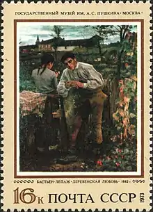 « Le soir, la conversation a repris et j'ai été agréablement surpris d'entendre : « Ainsi vous êtes donc comme cela ! » La raison de l'étonnement à mon propos était mon opinion sur le tableau de Bastien-Lepage L'Amour au village. Les idées émises étaient que ce tableau, par la force et la pureté des sentiments qu'il exprimait, aurait pu être exposé dans une église. La toile, par son caractère intime et profond, est plus russe que français. Avec L'Amour au village, le rituel du mariage devient plus touchant, plus authentique que les images froides et sans âme habituelles. Bastien-Lepage a exprimé en langage poétique dans cette peinture les pensées les plus pures de deux amoureux au cœur simple. »