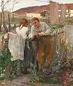 Le tableau représente un jeune homme et une jeune fille habillés à la mode paysanne, debout l'un à côté de l'autre, de part et d'autre d'une clôture en bois séparant deux terrains. Le jeune fille se tient de dos, son visage n'est pas visible. Elle est vêtue d'une longue jupe, les cheveux coiffés en deux tresses. Sur la clôture, elle a posé son foulard. Le jeune homme se tient face aux spectateurs, légèrement penché de telle manière que son visage soit à hauteur de celui de la jeune fille. Il porte une chemise de couleur claire et sa culotte est protégée d'un tablier particulier. Il a l'air gêné et peut-être est-ce parce qu'il parle de son amour. L'arrière-plan est constitué du clocher de l'église et de façades des maisons paysannes. Vers la droite, on aperçoit la silhouette d'une femme qui travaille[4].