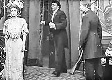 Capture d'écran d'une copie du film L'Appel de la forêt montrant les acteurs (de gauche à droite) Florence Lawrence, Charles Inslee et Harry Solter