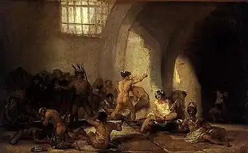 Dans une lettre de 1794 à son ami Bernardo de Yriarte, il écrivit qu’il peignait « un enclose avec des fous, deux d’entre eux se battant, complètement nus, alors que leurs gardiens les frappaient, eux et d’autres dans des sacs ; c’est une scène que j’ai vu à Saragosse[7] ». C’était le traitement usuel des fous, qui étaient enfermés avec des criminels, menottés et régulièrement sujets à des châtiments physiques. On note ici que les patients adoptent diverses postures, observation, assis, lutte, grimaçant. En haut du tableau tombe un soleil cru qui renforce l’atmosphère cauchemardesque de la scène.