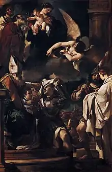 Reste à savoir comment ces messages ont pu parvenir jusqu'à la cour de France. A cet égard, il a été observé qu'il existe également quelques copies de petit format du retable, dont notamment une toile actuellement conservée au palais Barberini[7], peut-être réalisée dans l'atelier du Guerchin lui-même, dont la possible destination était Paris[8].