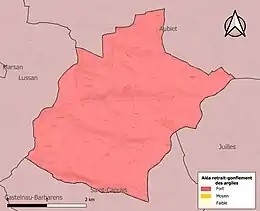 Le retrait-gonflement des sols argileux est susceptible d'engendrer des dommages importants aux bâtiments en cas d’alternance de périodes de sécheresse et de pluie. La totalité de la commune est en aléa moyen ou fort (94,5 % au niveau départemental et 48,5 % au niveau national). Sur les 71 bâtiments dénombrés sur la commune en 2019, 71 sont en aléa moyen ou fort, soit 100 %, à comparer aux 93 % au niveau départemental et 54 % au niveau national. Une cartographie de l'exposition du territoire national au retrait gonflement des sols argileux est disponible sur le site du BRGM[21],[Carte 3].