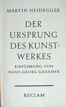Hans-Georg Gadamer[3] qui assista personnellement à l'une d'entre elles, révèle combien cette conférence fit sensation en raison de « la conceptualité inouïe et surprenante qui osait s'élever autour de ce thème », où il était question de « Monde » mais aussi en contrepoint de « Terre, » mots qui résonnaient « d'une tonalité mythique et gnostique »[N 1], du ciel et de la terre et aussi, du combat entre les deux[4]. Christian Dubois[5] à son tour insiste sur le caractère inattendu et majeur de cette volte‐face: rien dans son ouvrage maître Être et Temps ne laissait entendre qu’une œuvre d’art puisse servir de fil conducteur à la question du sens de l’être [N 2].