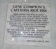 L'année suivante, la première émeute documentée de personnes transgenres a lieu. La émeute de la Compton's Cafeteria (en) dans le district de Tenderloin district of San Francisco a lieu en réaction au harcèlement et aux discriminations dont sont les l'objet les femmes trans dans cette cafétéria. Selon l’encyclopédie en ligne glbtq.com, à la suite de cette émeute, un réseau de soutien social, psychologique et médical est organisé, ce qui donne naissance en 1968 au National Transsexual Counseling Unit, la première organisation d'autosupport et de défense par et pour les personnes trans au monde[24].