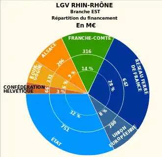 Le financement de la ligne (hors matériel roulant[27],[28], bâtiments voyageurs des gares nouvelles et ateliers de maintenance[29] qui font tous trois l'objet d'une convention de financement autonome avec la SNCF) est réparti de la manière suivante[29] :