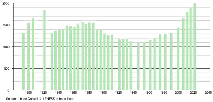 L'évolution du nombre d'habitants est connue à travers les recensements de la population effectués dans la commune depuis 1793. Pour les communes de moins de 10 000 habitants, une enquête de recensement portant sur toute la population est réalisée tous les cinq ans, les populations légales des années intermédiaires étant quant à elles estimées par interpolation ou extrapolation[20]. Pour la commune, le premier recensement exhaustif entrant dans le cadre du nouveau dispositif a été réalisé en 2006[21].