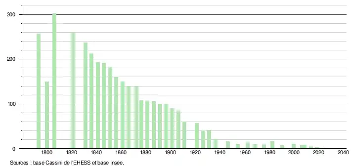 L'évolution du nombre d'habitants est connue à travers les recensements de la population effectués dans la commune depuis 1793. Pour les communes de moins de 10 000 habitants, une enquête de recensement portant sur toute la population est réalisée tous les cinq ans, les populations légales des années intermédiaires étant quant à elles estimées par interpolation ou extrapolation[27]. Pour la commune, le premier recensement exhaustif entrant dans le cadre du nouveau dispositif a été réalisé en 2008[28].