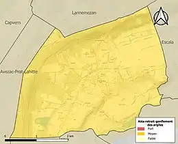 Le retrait-gonflement des sols argileux est susceptible d'engendrer des dommages importants aux bâtiments en cas d’alternance de périodes de sécheresse et de pluie. La totalité de la commune est en aléa moyen ou fort (44,5 % au niveau départemental et 48,5 % au niveau national). Sur les 607 bâtiments dénombrés sur la commune en 2019, 607 sont en aléa moyen ou fort, soit 100 %, à comparer aux 75 % au niveau départemental et 54 % au niveau national. Une cartographie de l'exposition du territoire national au retrait gonflement des sols argileux est disponible sur le site du BRGM[38],[Carte 3].