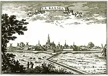 Pendant la guerre franco-espagnole de 1635-1659, La Bassée est une place forte des Pays-Bas espagnols. Elle sert de refuge aux villageois des environs et à leurs troupeaux menacés par les incursions de l'armée française. Elle repousse un coup de main français le et, après la prise d'Arras par les Français en 1640, les Espagnols renforcent ses remparts mais, le , le maréchal de La Meilleraye s'en empare après huit jours de siège. La garnison, forte de 1 800 hommes, obtient de se retirer avec les honneurs de la guerre[21]. Les États des Pays-Bas, excédés par les pillages des Français, demandent au gouverneur espagnol Francisco de Melo de reprendre La Bassée et lui offrent un subside de 80 000 florins. Melo se met en campagne avec 5 régiments espagnols, 3 italiens et 5 wallons ; il reprend Lens le , puis La Bassée, qui se rend le après 24 jours de siège ; la garnison française, commandée par le capitaine Bourdonnet, évacue la place avec les honneurs[22].