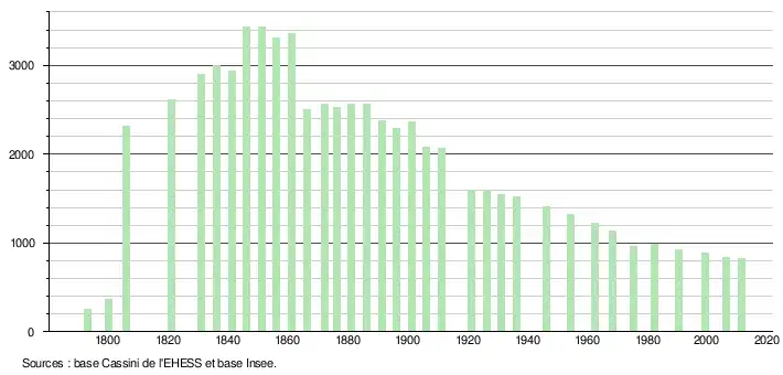 L'évolution du nombre d'habitants est connue à travers les recensements de la population effectués dans la commune depuis 1793. À partir du , les populations légales des communes sont publiées annuellement dans le cadre d'un recensement qui repose désormais sur une collecte d'information annuelle, concernant successivement tous les territoires communaux au cours d'une période de cinq ans. Pour les communes de moins de 10 000 habitants, une enquête de recensement portant sur toute la population est réalisée tous les cinq ans, les populations légales des années intermédiaires étant quant à elles estimées par interpolation ou extrapolation[3]. Pour la commune, le premier recensement exhaustif entrant dans le cadre du nouveau dispositif a été réalisé en 2006[4],[Note 1].