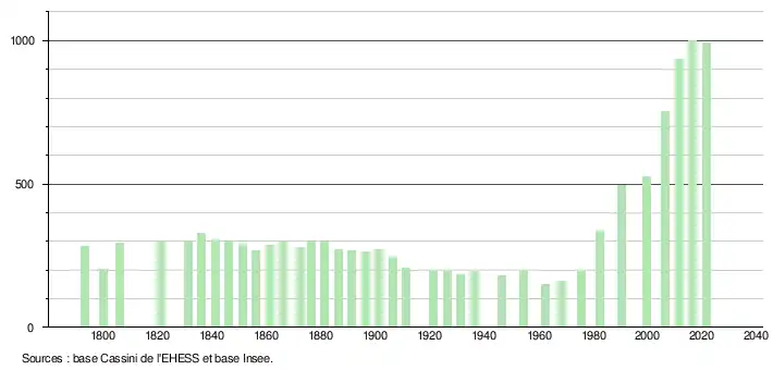 L'évolution du nombre d'habitants est connue à travers les recensements de la population effectués dans la commune depuis 1793. Pour les communes de moins de 10 000 habitants, une enquête de recensement portant sur toute la population est réalisée tous les cinq ans, les populations légales des années intermédiaires étant quant à elles estimées par interpolation ou extrapolation[20]. Pour la commune, le premier recensement exhaustif entrant dans le cadre du nouveau dispositif a été réalisé en 2006[21].
