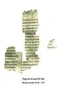 Aucun des plus de 5 000 manuscrits grecs du Nouveau Testament retrouvés ne contient le tétragramme[28],[29]. La grande majorité des manuscrits de l'Ancien Testament écrits en grec ne le contiennent pas non plus, mais il y en a quelques exceptions. Dans le Papyrus Fouad 266b, qui est une copie du Deutéronome en grec datant du Ier siècle av. J.-C.[30], un premier scribe a écrit le texte en grec, laissant un espace vide à la place du nom de Dieu, où un second scribe a ensuite ajouté le tétragramme[31]. Le papyrus Vindobonensis grec 39777 (en), qui date de la fin du IIIe siècle apr. J.-C, contient lui aussi le tétragramme en caractères hébraïques, mais il s'agit de la traduction faite au IIe siècle apr. J.-C, par Aquila de Sinope et non pas de la version préchrétienne, la Septante[31],[32]. Emmanuel Tov, professeur à l’Université de Jérusalem, a fait une recension des manuscrits fragmentaires de la Septante et des versions de l'Ancien Testament faites par Symmache et Aquila. Ces manuscrits ont été rédigés entre le Ier siècle av. J.-C. et le Ve siècle apr. J.-C. La grande majorité des manuscrits grecs de la Septante contiennent kyrios : il n'y en a que très peu où le tétragramme a été écrit soit en paléo-hébreu, soit en araméen[33],[31].