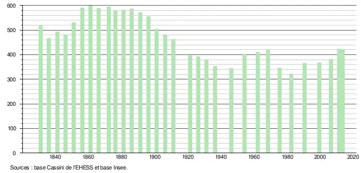 L'évolution du nombre d'habitants est connue à travers les recensements de la population effectués dans la commune depuis 1831. À partir du , les populations légales des communes sont publiées annuellement dans le cadre d'un recensement qui repose désormais sur une collecte d'information annuelle, concernant successivement tous les territoires communaux au cours d'une période de cinq ans. Pour les communes de moins de 10 000 habitants, une enquête de recensement portant sur toute la population est réalisée tous les cinq ans, les populations légales des années intermédiaires étant quant à elles estimées par interpolation ou extrapolation[17]. Pour la commune, le premier recensement exhaustif entrant dans le cadre du nouveau dispositif a été réalisé en 2006[18],[Note 1].