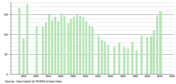 L'évolution du nombre d'habitants est connue à travers les recensements de la population effectués dans la commune depuis 1793. Pour les communes de moins de 10 000 habitants, une enquête de recensement portant sur toute la population est réalisée tous les cinq ans, les populations légales des années intermédiaires étant quant à elles estimées par interpolation ou extrapolation[18]. Pour la commune, le premier recensement exhaustif entrant dans le cadre du nouveau dispositif a été réalisé en 2005[19].