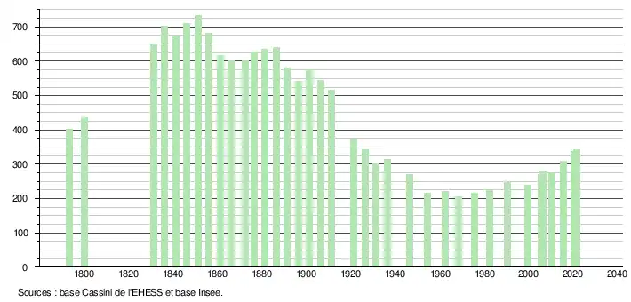 L'évolution du nombre d'habitants est connue à travers les recensements de la population effectués dans la commune depuis 1793. Pour les communes de moins de 10 000 habitants, une enquête de recensement portant sur toute la population est réalisée tous les cinq ans, les populations légales des années intermédiaires étant quant à elles estimées par interpolation ou extrapolation[42]. Pour la commune, le premier recensement exhaustif entrant dans le cadre du nouveau dispositif a été réalisé en 2005[43].