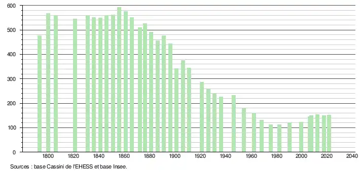 - Population municipale légale en vigueur au 1er janvier 2024, millésimée 2021, définie dans les limites territoriales en vigueur au 1er janvier 2023, date de référence statistique : 1er janvier 2021.