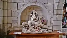 - L'Église Saint-Martin est inscrite à l'inventaire supplémentaire des monuments historiques[30] depuis 1948. La nef est d'époque romane (XIIe siècle) et a été reprise au XVIe siècle. Elle est recouverte d'une fausse voûte depuis 1922, et s'ouvre au nord sur une petite chapelle seigneuriale du XVe siècle où se trouve une Piéta, redécouverte en plusieurs morceaux en 1902, après avoir été cachée dans les maçonneries du clocher, probablement pour échapper aux destructions pendant les Guerres de Religion ou la Révolution. Cette Piéta a été restaurée deux fois, après sa redécouverte puis en 1994. Le chœur et son collatéral nord sont gothiques, attribués au XIIIe siècle. Leurs hautes voûtes d'ogive (XIVe siècle) sont remarquables. En 1520, deux contreforts viennent soutenir la façade. Le maître-autel et le retable sont inscrits au titre des monuments historiques ; ils ont été acquis en 1823, on ignore leur provenance. Une cuve baptismale du XVe siècle ou XVIe siècle est également inscrite au titre des monuments historiques.