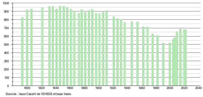 L'évolution du nombre d'habitants est connue à travers les recensements de la population effectués dans la commune depuis 1793. Pour les communes de moins de 10 000 habitants, une enquête de recensement portant sur toute la population est réalisée tous les cinq ans, les populations légales des années intermédiaires étant quant à elles estimées par interpolation ou extrapolation[26]. Pour la commune, le premier recensement exhaustif entrant dans le cadre du nouveau dispositif a été réalisé en 2004[27].