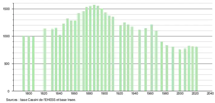 L'évolution du nombre d'habitants est connue à travers les recensements de la population effectués dans la commune depuis 1793. Pour les communes de moins de 10 000 habitants, une enquête de recensement portant sur toute la population est réalisée tous les cinq ans, les populations légales des années intermédiaires étant quant à elles estimées par interpolation ou extrapolation[19]. Pour la commune, le premier recensement exhaustif entrant dans le cadre du nouveau dispositif a été réalisé en 2006[20].