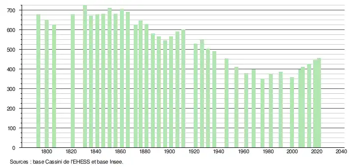 L'évolution du nombre d'habitants est connue à travers les recensements de la population effectués dans la commune depuis 1793. Pour les communes de moins de 10 000 habitants, une enquête de recensement portant sur toute la population est réalisée tous les cinq ans, les populations légales des années intermédiaires étant quant à elles estimées par interpolation ou extrapolation[20]. Pour la commune, le premier recensement exhaustif entrant dans le cadre du nouveau dispositif a été réalisé en 2008[21].