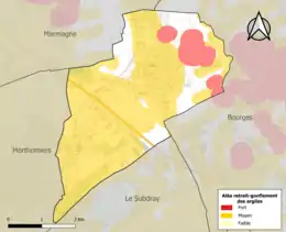 La commune est vulnérable au risque de mouvements de terrains constitué principalement du retrait-gonflement des sols argileux[18]. Cet aléa est susceptible d'engendrer des dommages importants aux bâtiments en cas d’alternance de périodes de sécheresse et de pluie. 83,8 % de la superficie communale est en aléa moyen ou fort (90 % au niveau départemental et 48,5 % au niveau national). Sur les 1 522 bâtiments dénombrés sur la commune en 2019, 1405 sont en aléa moyen ou fort, soit 92 %, à comparer aux 83 % au niveau départemental et 54 % au niveau national. Une cartographie de l'exposition du territoire national au retrait gonflement des sols argileux est disponible sur le site du BRGM[19],[Carte 2].