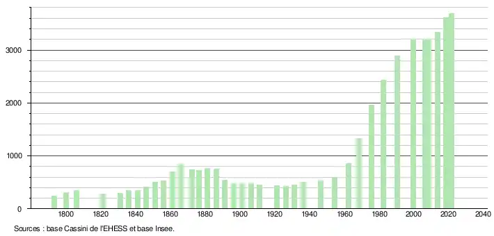 L'évolution du nombre d'habitants est connue à travers les recensements de la population effectués dans la commune depuis 1793. Pour les communes de moins de 10 000 habitants, une enquête de recensement portant sur toute la population est réalisée tous les cinq ans, les populations légales des années intermédiaires étant quant à elles estimées par interpolation ou extrapolation[28]. Pour la commune, le premier recensement exhaustif entrant dans le cadre du nouveau dispositif a été réalisé en 2008[29].