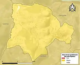 Le retrait-gonflement des sols argileux est susceptible d'engendrer des dommages importants aux bâtiments en cas d’alternance de périodes de sécheresse et de pluie. 99,6 % de la superficie communale est en aléa moyen ou fort (26,8 % au niveau départemental et 48,5 % au niveau national). Sur les 203 bâtiments dénombrés sur la commune en 2019, 194 sont en aléa moyen ou fort, soit 96 %, à comparer aux 36 % au niveau départemental et 54 % au niveau national. Une cartographie de l'exposition du territoire national au retrait gonflement des sols argileux est disponible sur le site du BRGM[18],[Carte 2].