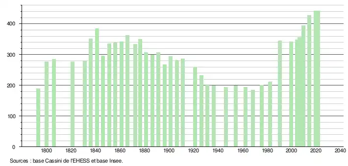 L'évolution du nombre d'habitants est connue à travers les recensements de la population effectués dans la commune depuis 1793. Pour les communes de moins de 10 000 habitants, une enquête de recensement portant sur toute la population est réalisée tous les cinq ans, les populations légales des années intermédiaires étant quant à elles estimées par interpolation ou extrapolation[24]. Pour la commune, le premier recensement exhaustif entrant dans le cadre du nouveau dispositif a été réalisé en 2004[25].