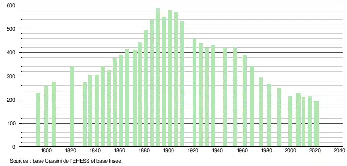 L'évolution du nombre d'habitants est connue à travers les recensements de la population effectués dans la commune depuis 1793. Pour les communes de moins de 10 000 habitants, une enquête de recensement portant sur toute la population est réalisée tous les cinq ans, les populations légales des années intermédiaires étant quant à elles estimées par interpolation ou extrapolation[18]. Pour la commune, le premier recensement exhaustif entrant dans le cadre du nouveau dispositif a été réalisé en 2005[19].